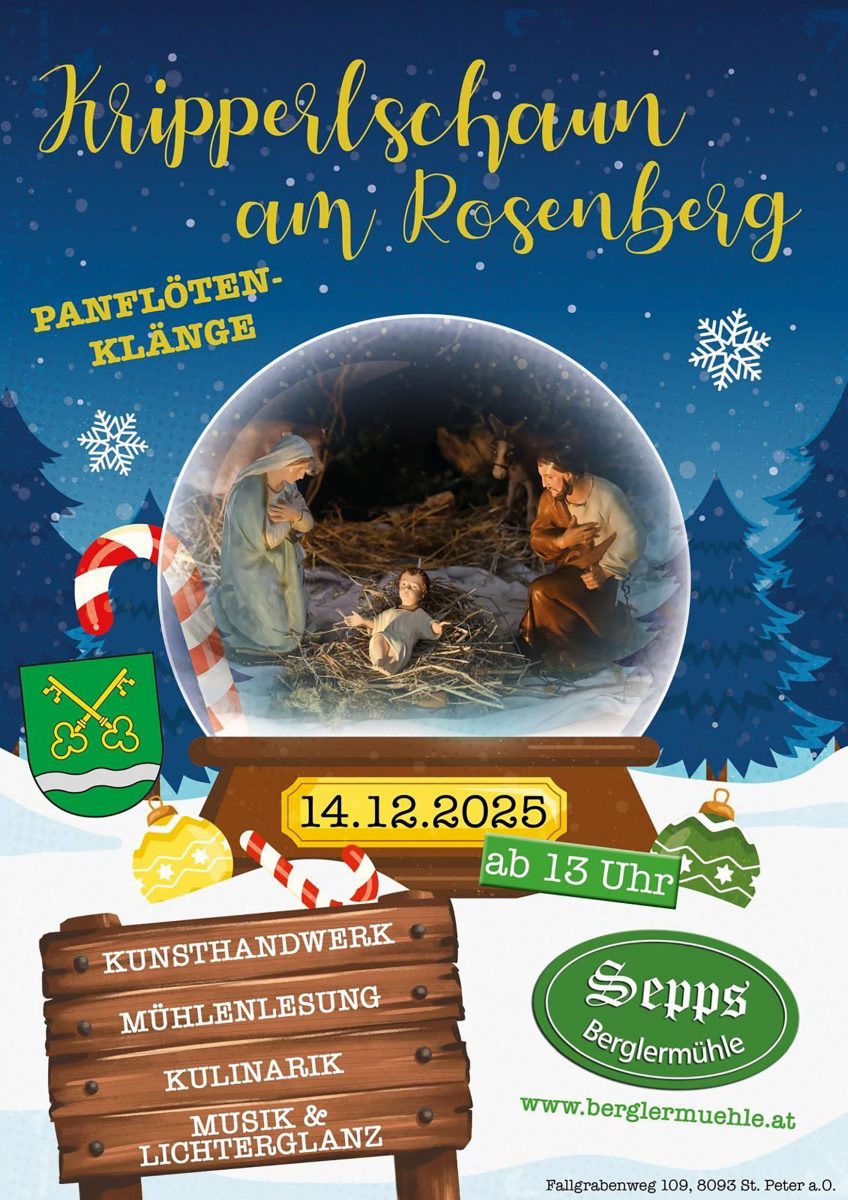 Heuer erstmals am Rosenberg, wir haben uns entschieden heuer einen kleinen aber feinen Weihnatsmarkt am Rosenberg im Gelände der Berglermühle abzuhalten. Mit einigen Kunsthandwerkaustellern, Lesungen in der 100 jährigen Mühle für unsere Kleinen, Adventmusik, Panflöten Spieler Sängern Licht und Feuer möchten wir eine Woch vor Weihnachten ein wenig Adventstimmung bei uns für alle verbreiten!